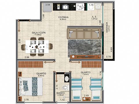 Sala em dois ambientes com sacada, 02 quartos sendo um suite, banheiro social, cozinha, área de serviço, garagem.