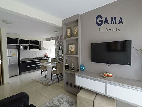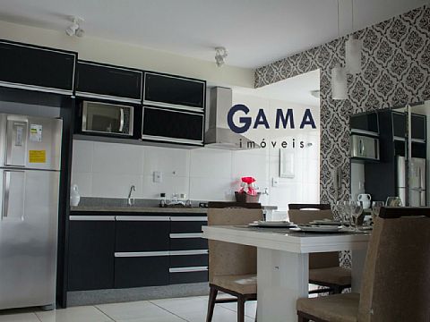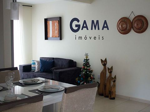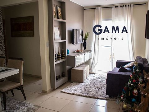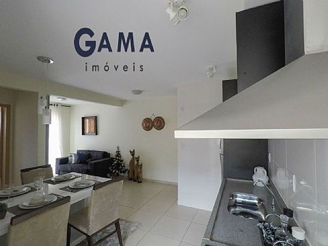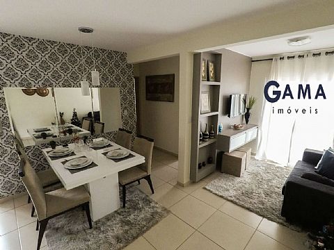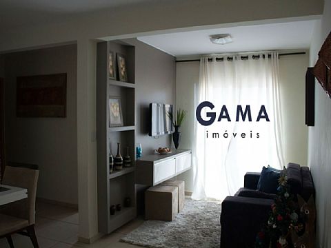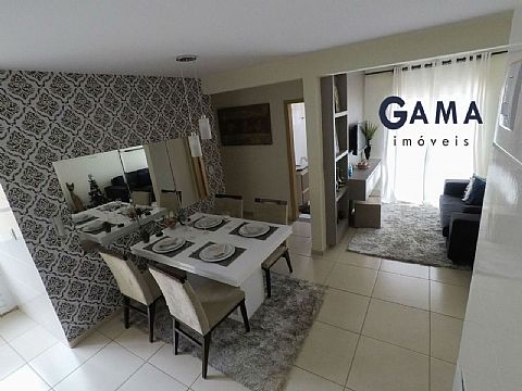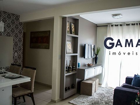 Sala em dois ambientes, dois quartos, banheiro social, cozinha, área de serviço e garagem para um carro.