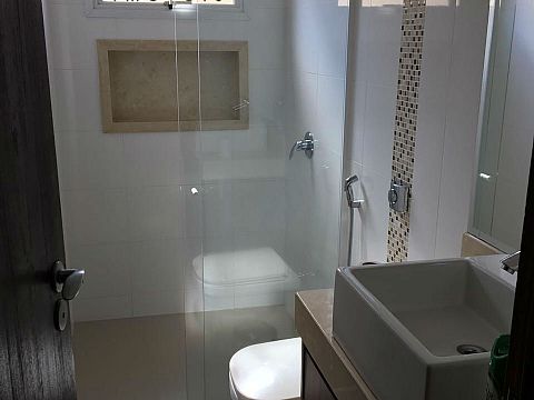 Casa 160mts Terreno de 250mts, 03 quartos (suite) 02 banheiros sociais Excelente área de lazer Armários nas duas cozinhas Armários nos banheiros (Quartos sem armários) Pedraria fina (crema marfil) Sala ampla c 30 mts Cozinha integrada com a sala Garagem para 05 carros (02 vagas cobertas) Água com aquecimento solar (inclusive nas duas cozinhas).