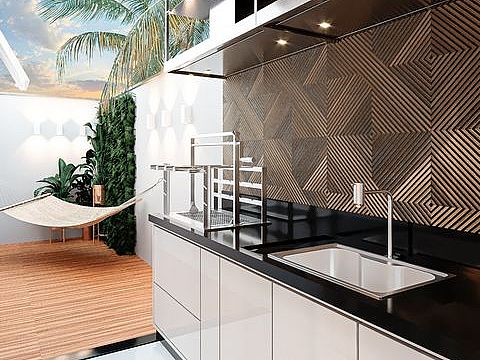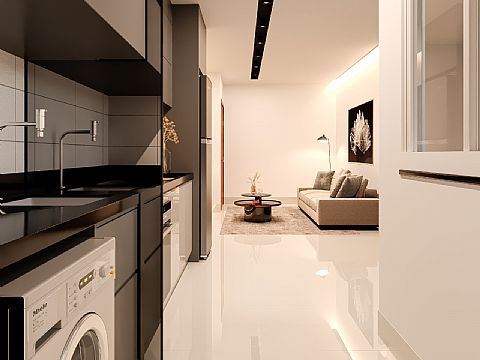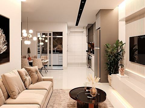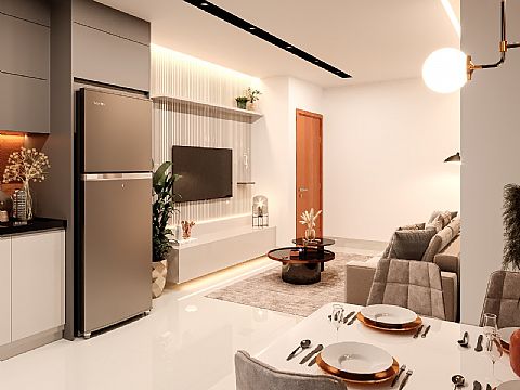 Sala integrada a cozinha estilo americano, 02 quartos sendo 01 suíte, banheiro social, área de serviço e garagem. Prédio tem área de lazer